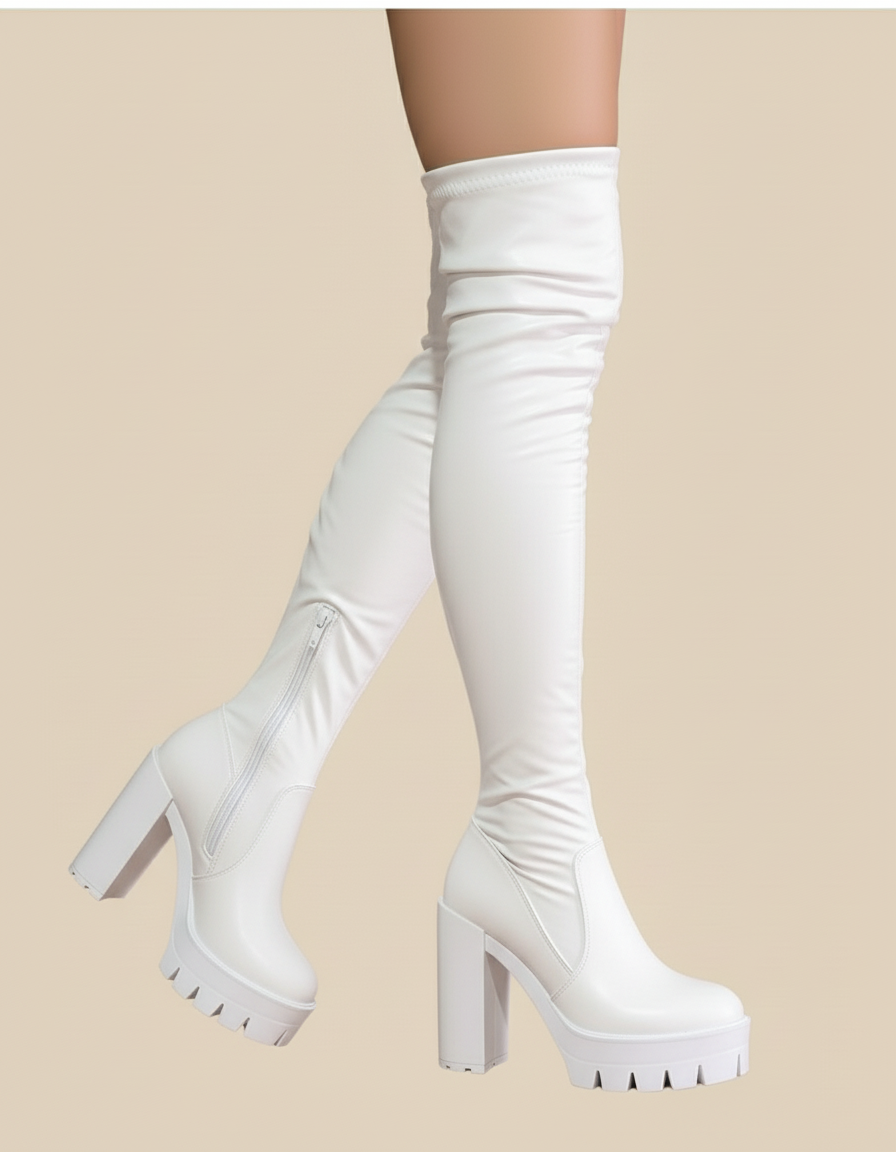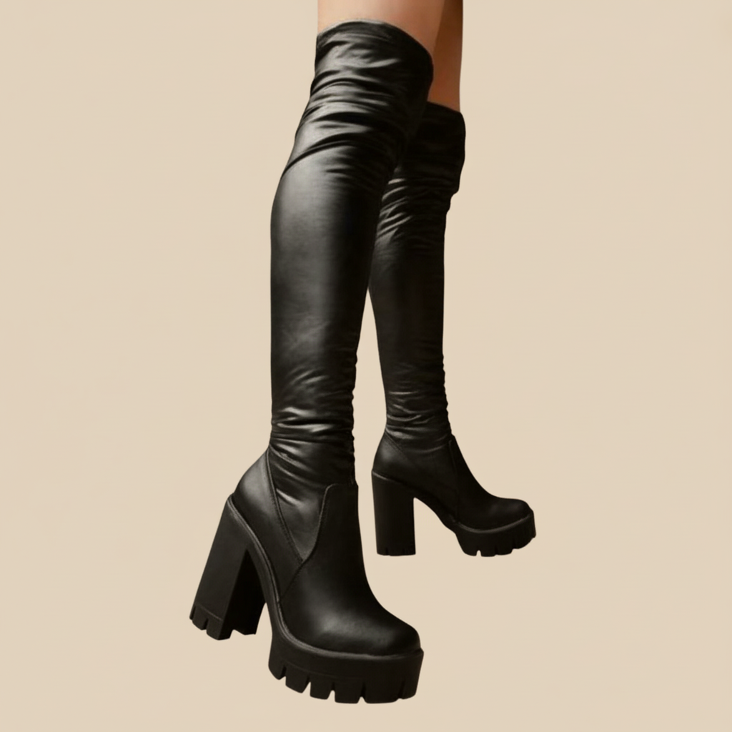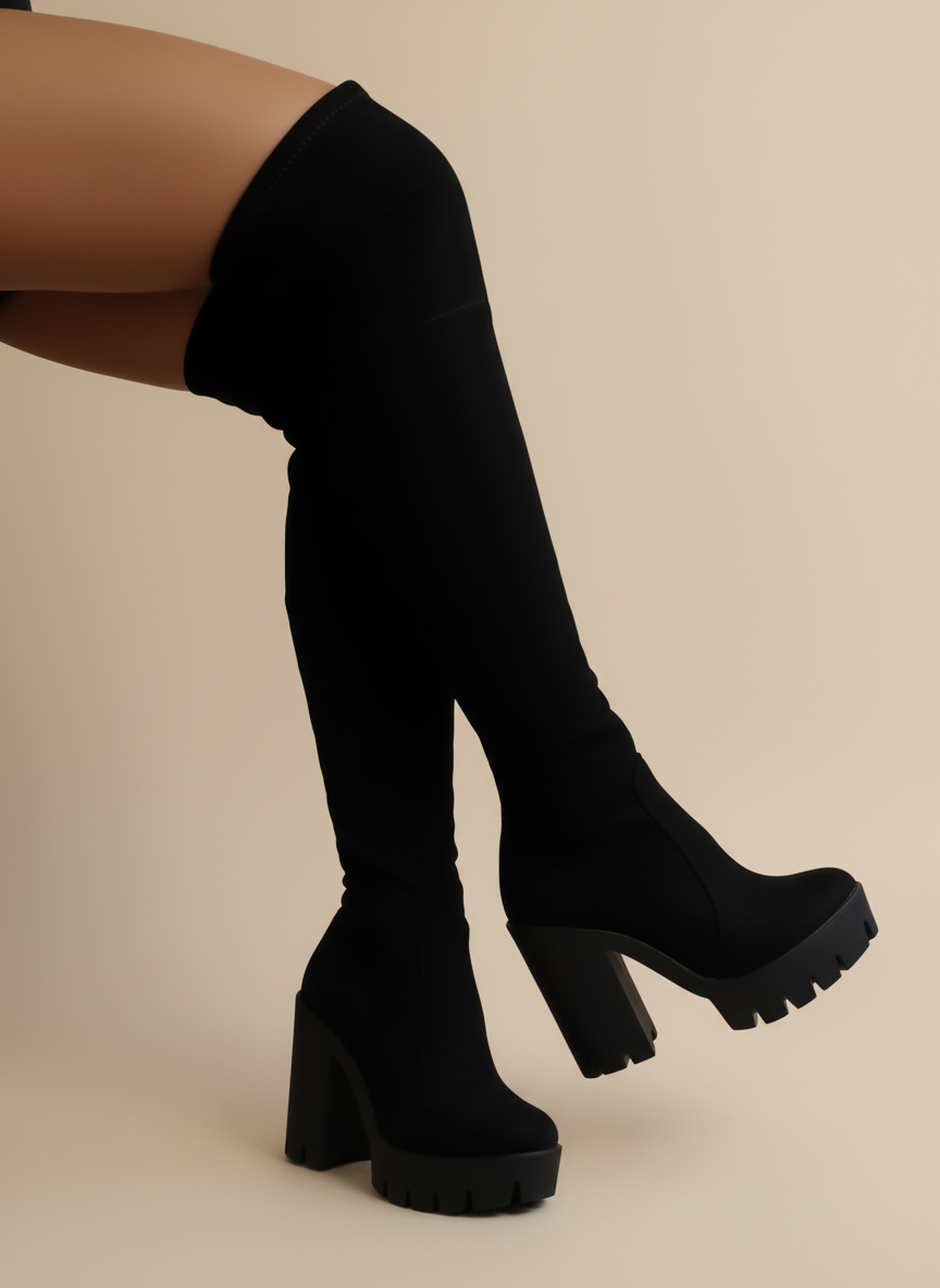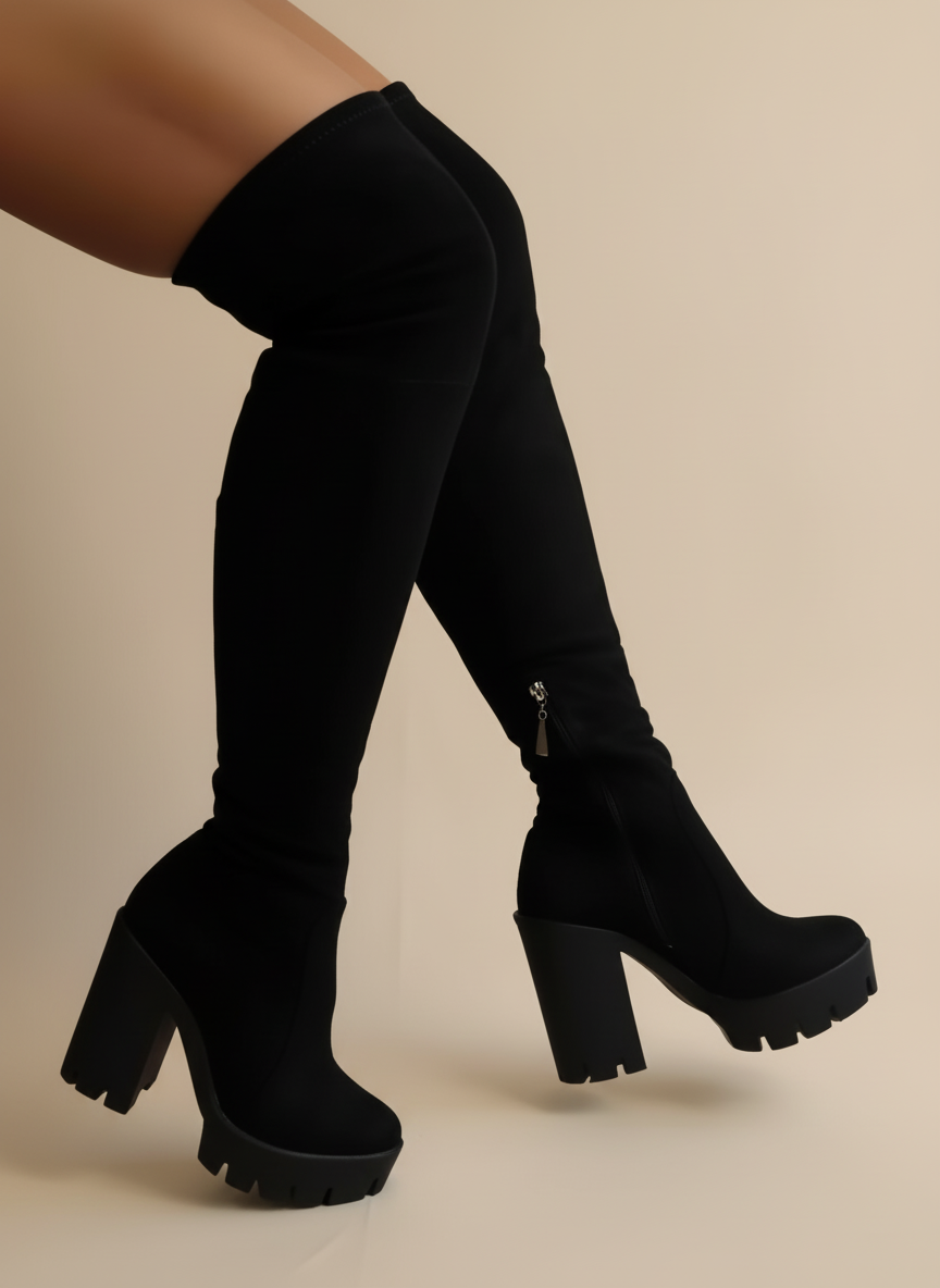 Bota alta tipo over the knee con plataforma y tacón grueso. Un diseño audaz que combina elegancia y poder en cada paso.